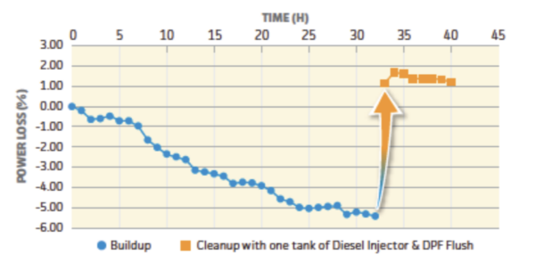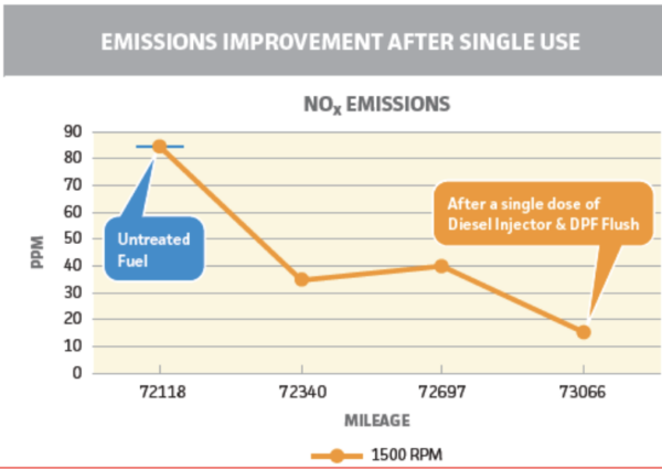 Diesel Injector & DPF Flush reduces NOx and black smoke by up to 50%. That is good for more than just the environment. Lower emissions reduce stress on the exhaust system by reducing soot buildup on the DPF and EGR, reducing maintenance cost and downtime.